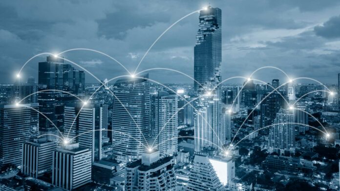 Network business conection system on cityscape background